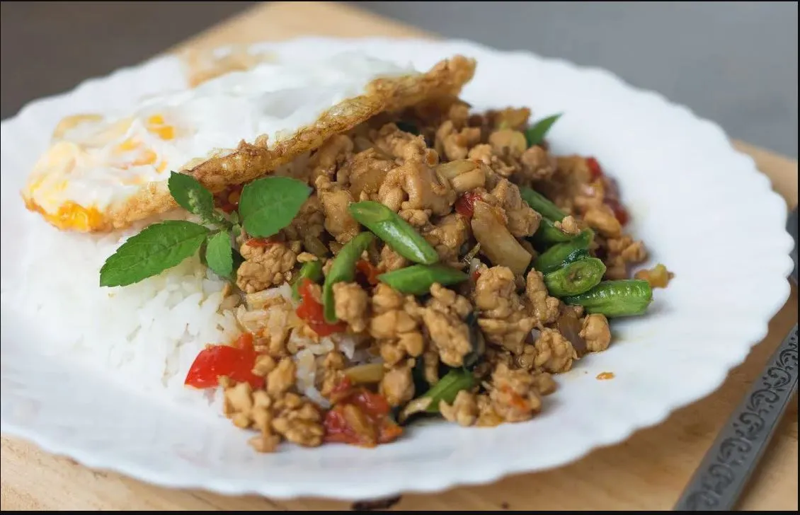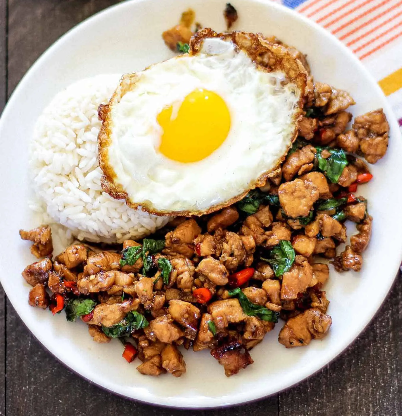Thai flavored spicy basil with your choice of meat. Top with green bean, thai chili, and basil leaves.
