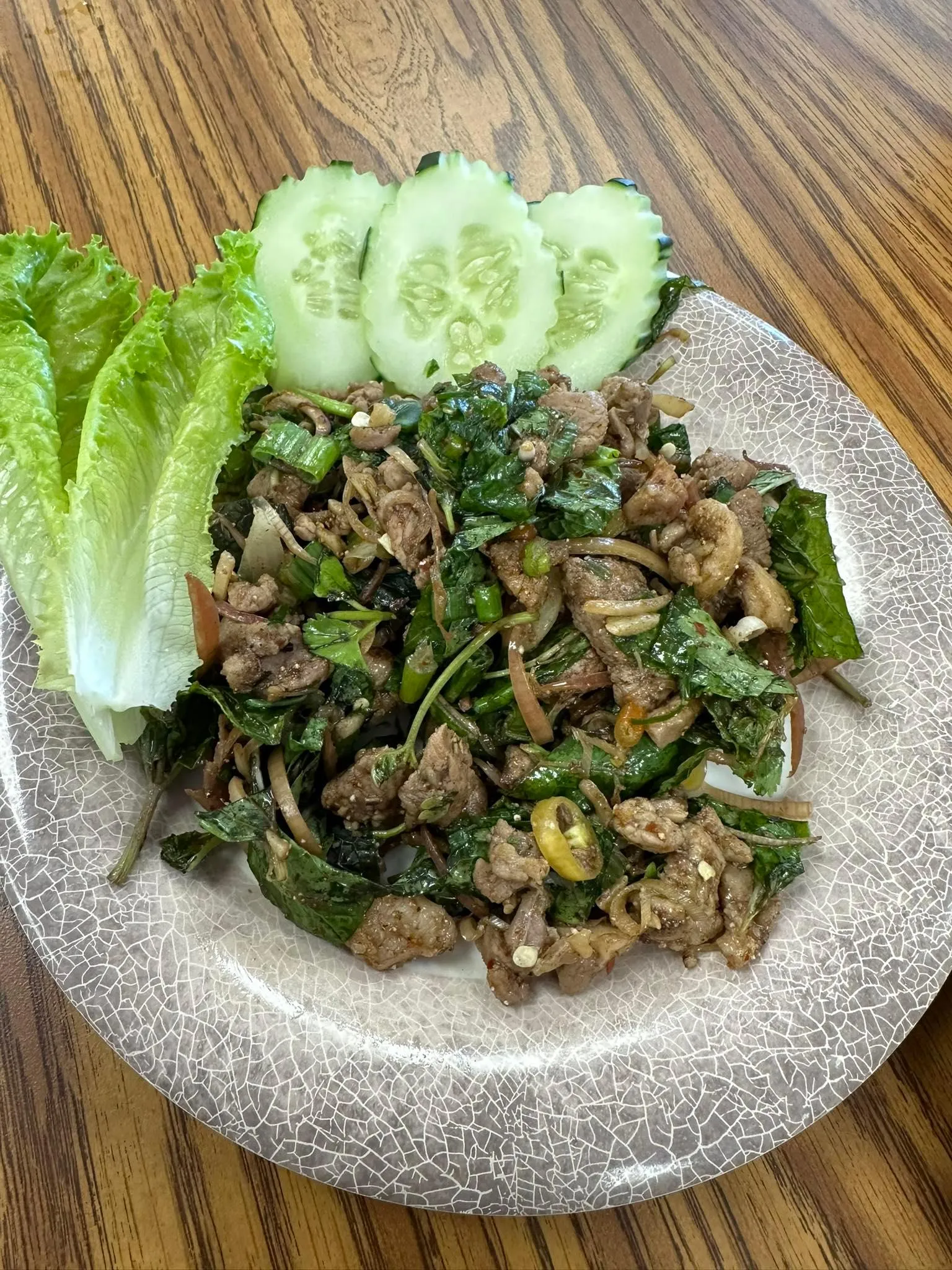 Authentic Lao style larb beef with cilantro, green onion, ground rice, and homemade mixing sauce. Served with fresh lettuce, Thai eggplant, and cucu....