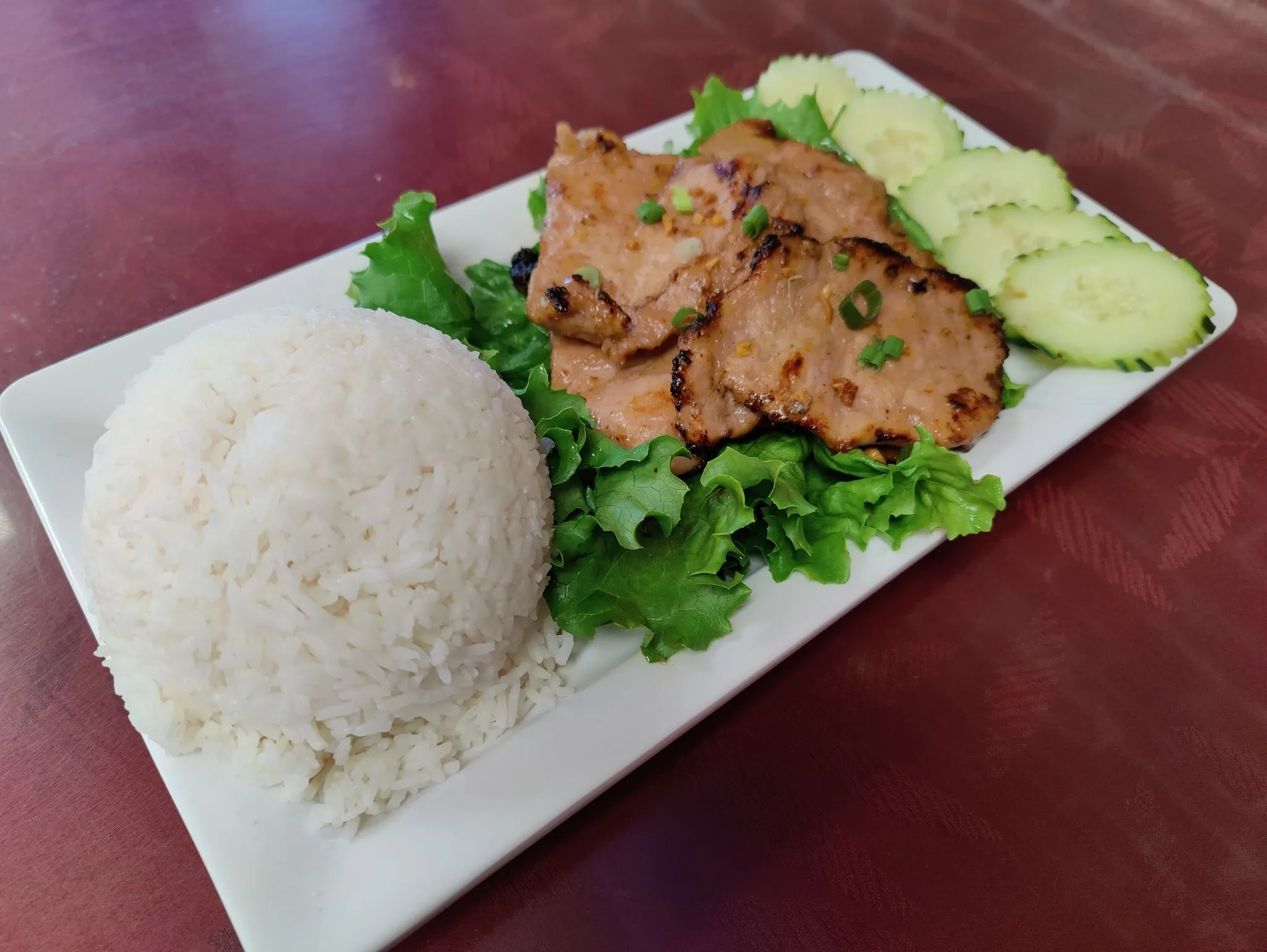 Grilled marinated pork loins in house special sauce served with steamed rice.