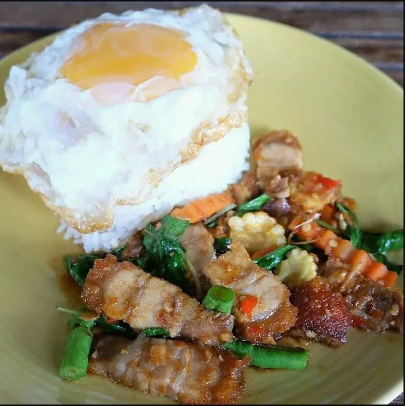Thai flavored spicy basil with crispy pork. Top with green bean, thai chili, and basil leaves.