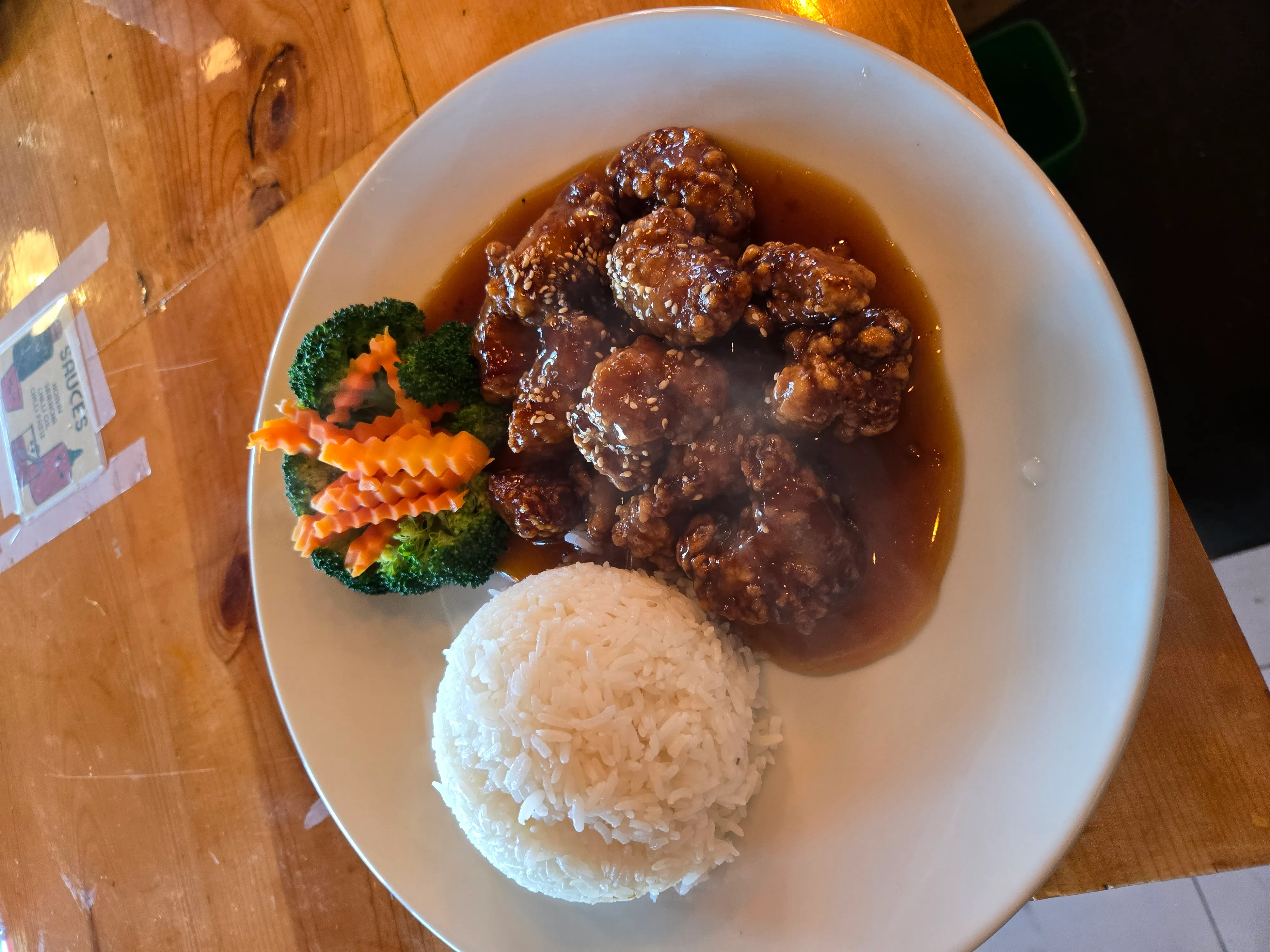 House special orange sauce over boneless lightly battered fried chicken breast chunks served with steamed rice.