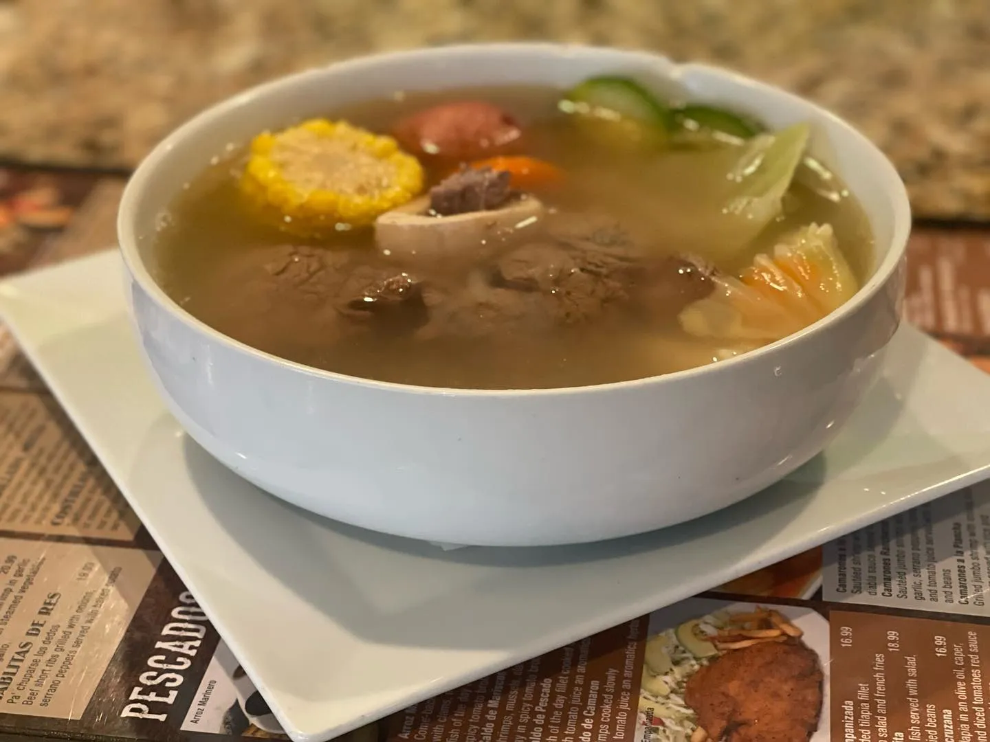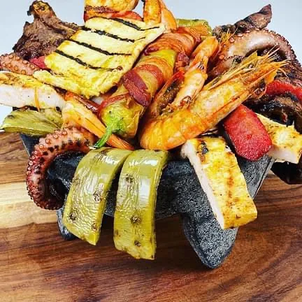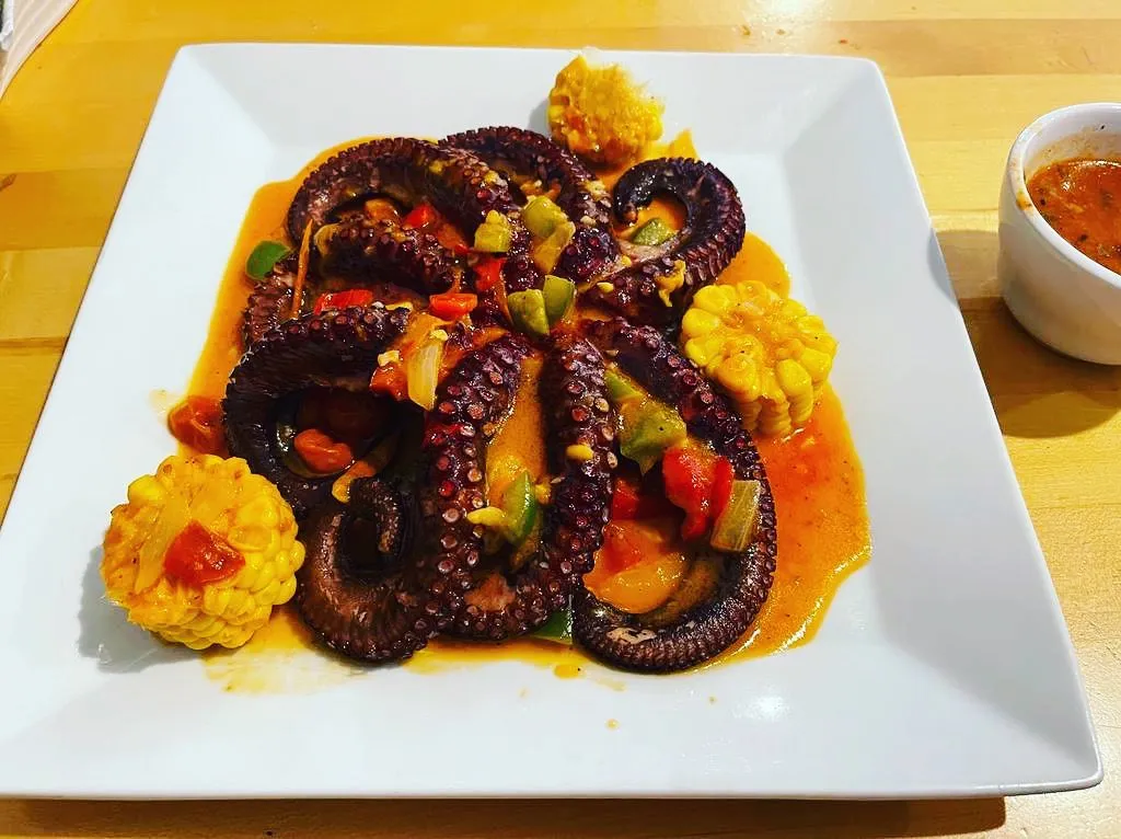 Pescado Envuelto at $18.99 Still haven't tried our delicious Pescado Envuelto?Fish wrapped in foil and staffed with shrimps, octopus, crab meat, tomato, cilantro, melted cheese, and tomato juice. Served with rice and salad.